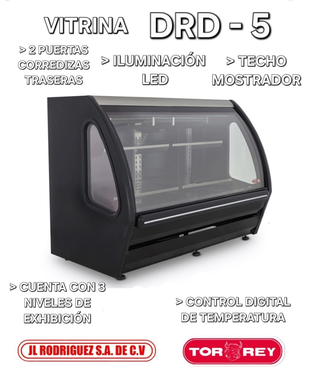Vitrina marca Torrey modelo DRD-5, Sándwich frontal plano, puertas corredizas solidas. Charolas y mostrador en acero inoxidable.